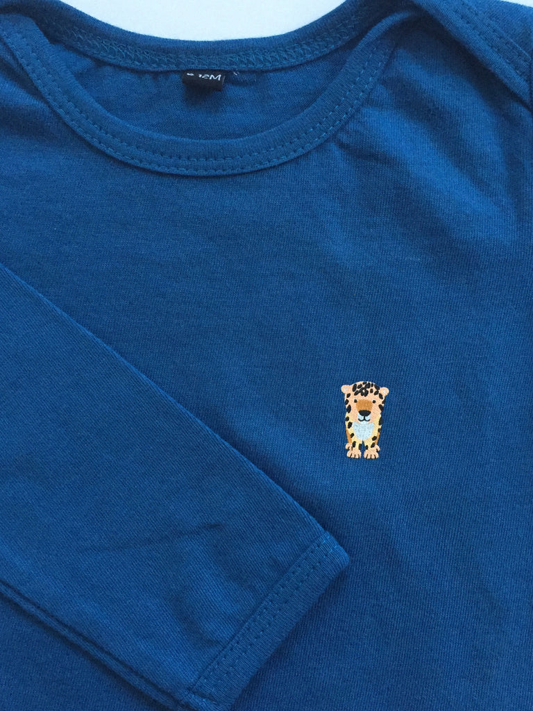Cheetah print on a flat knit jersey onesie. 100% organic cotton.