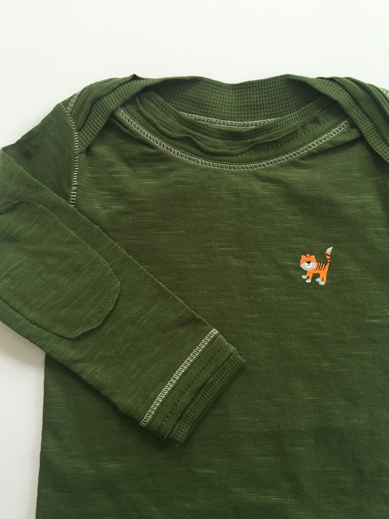 Tiger print on a slub knit jersey onesie with contrast stitching. Elbow patches, tush patch. Raw edges at cuffs, hem and neckline backed with waffle trim. 100% organic cotton.